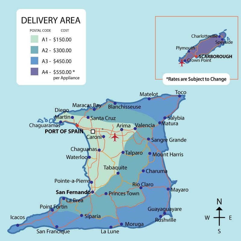 - Reliable Appliance Parts and Service Ltd. has divided Trinidad and Tobago into four delivery regions (Area 1 to Area 4), each with specific delivery charges.